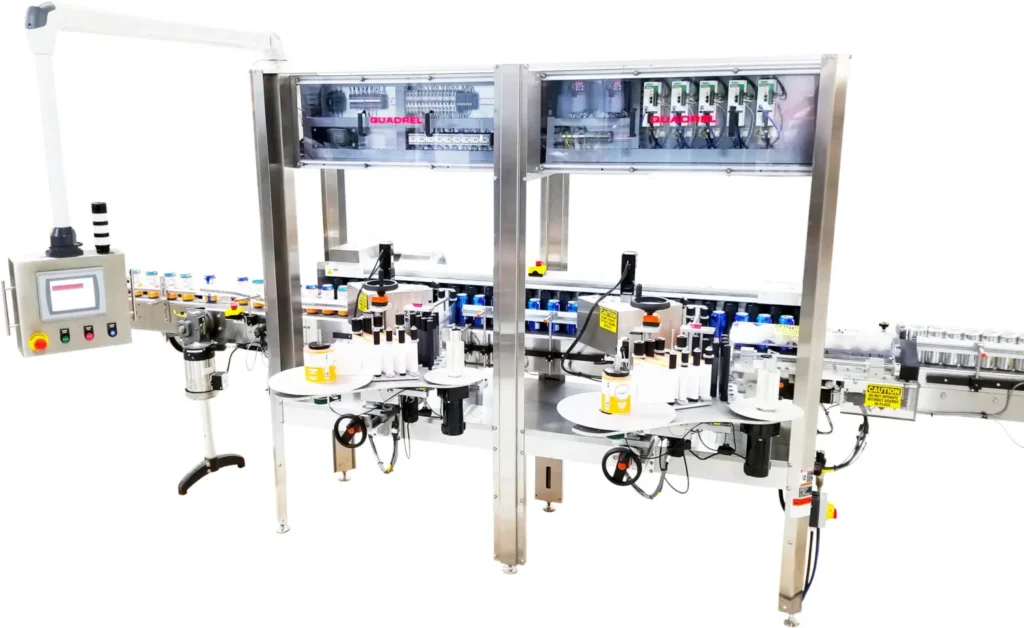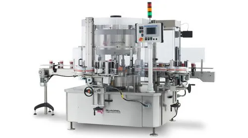 This rotary platform applies front/back/neck labels at up to 200 BPM—featuring Allen-Bradley controls, programmable platforms, and precision alignment for glass bottles.